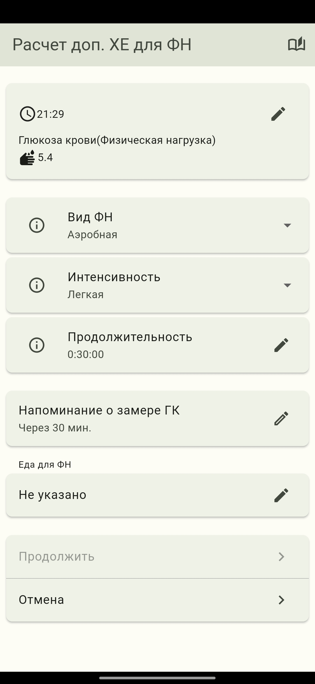 Вы можете использовать данный калькулятор для расчета дополнительных углеводов при физической нагрузке.Упражнения с низкой и средней нагрузкой усиливают действие любого активного инсулина (и других препаратов, снижающих уровень глюкозы в крови), что означает, что вам нужно меньше инсулина и, возможно, дополнительные углеводы, чтобы покрыть дополнительное падение сахара в крови. Если вы выполняете высокоэффективные упражнения, близкие к аэробному порогу, это может вызвать выброс адреналина, который противодействует инсулину. MYD предлагает выбрать три типа упражнений и четыре уровня их интенсивности, а также с учетом продолжительности физической нагрузки помогает Вам правильно настроить дозировку дополнительно принимаемых углеводов. MYD отслеживает остаточный инсулин в организме.При физической нагрузке следует контролировать уровень глюкозы крови каждые 30 минут, а также употреблять дополнительные углеводы, если это необходимо каждые 30 минут.