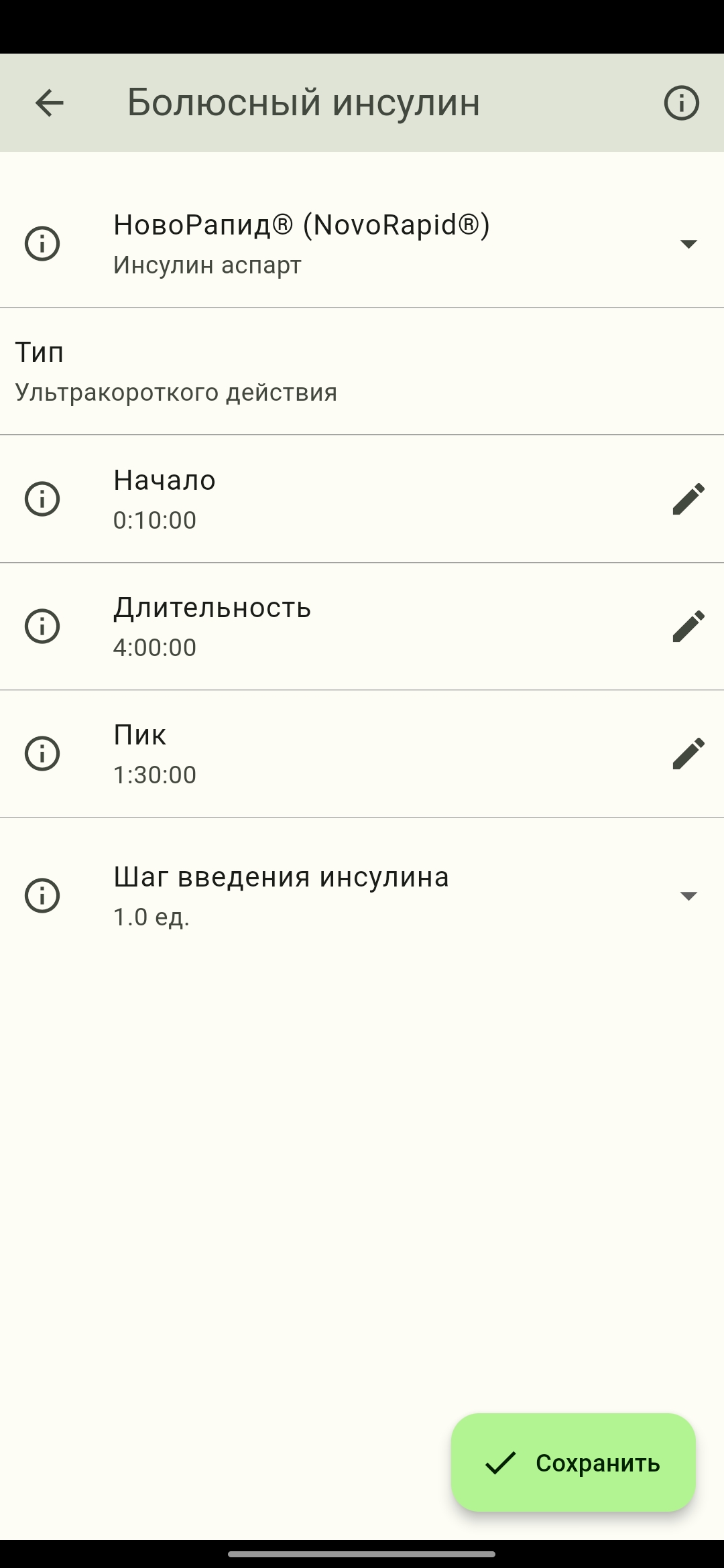 На следующем экране Вы можете внести изменения в предустановленные значения профиля действия инсулина (начало действия, длительность, пик действия). Вносите изменения только при необходимости.